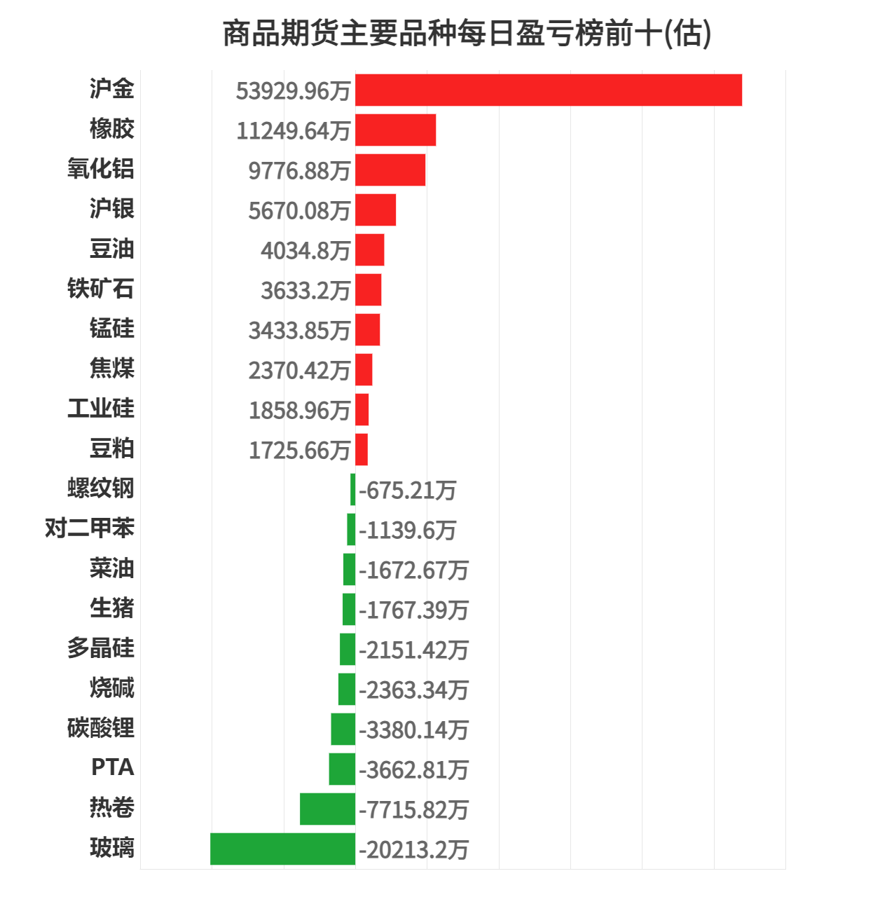 品种盈亏榜:今日商品期货上榜机构席位中沪金盈利第一,为53929.96万元。