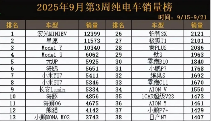 9月份第三周的诸多纯电车型销量数据出炉,数据显示宏光miniEV、吉利星源分别位居前两名,第三名就是的model Y,而这三款车型也是诸多车型当中周销量破万的车型,model Y的周销量达到1.034万辆。